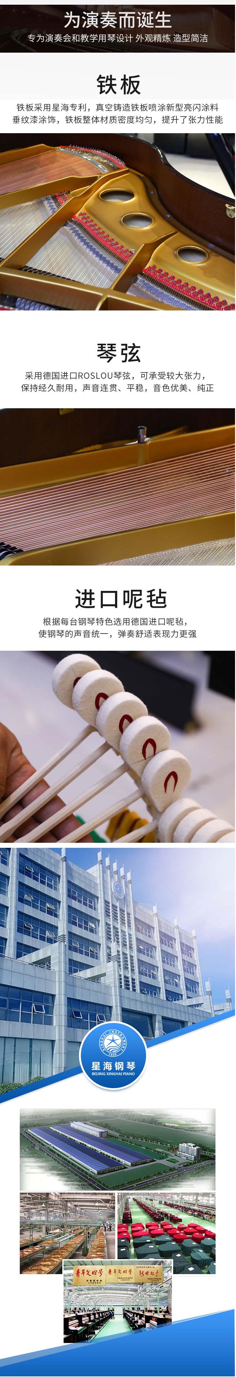 鐵 板:鋼板采用真空鑄造技術,抗張力性能提高,其棱角清晰,表面細膩,噴涂了星海新型亮閃涂料,凸顯了金屬質感,根據(jù)鋼琴發(fā)聲原理進行的結構設計,提高了三個音區(qū)的協(xié)振性能。